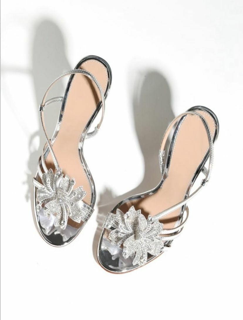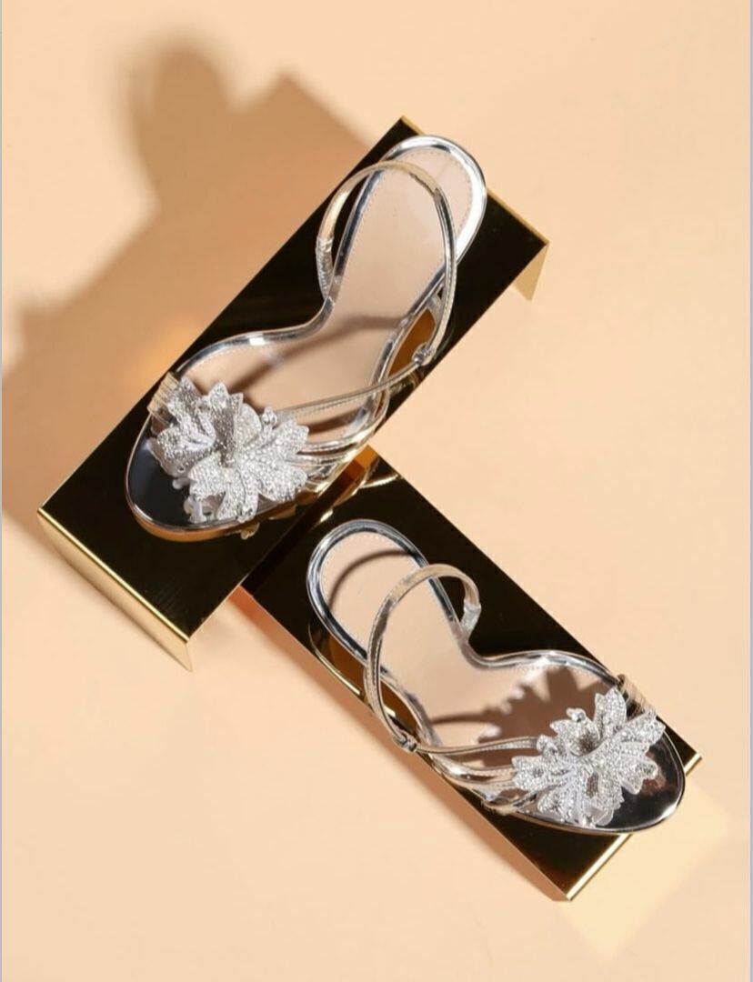 Sandália fechada no calcanhar, laço de strass na frente e atrás da sandália