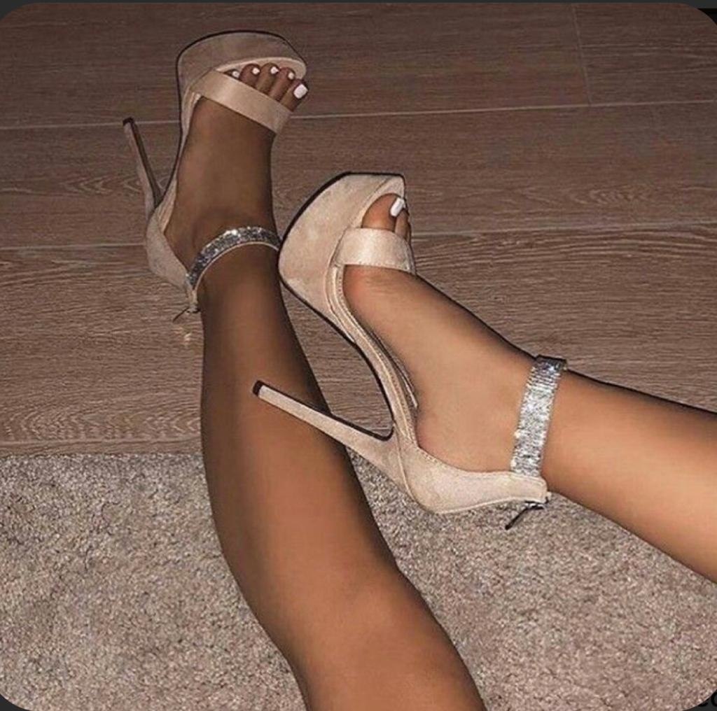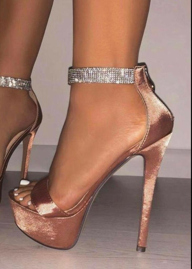 Sandália fechada no calcanhar, tira no cetim sobre os dedos do pé e uma tira em strass no tornozelo