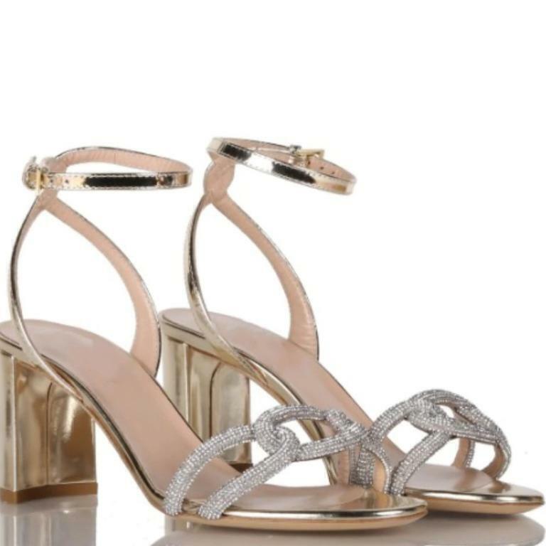 Sandália aberta no calcanhar, tiras em strass sobre os dedos formando uma corrente