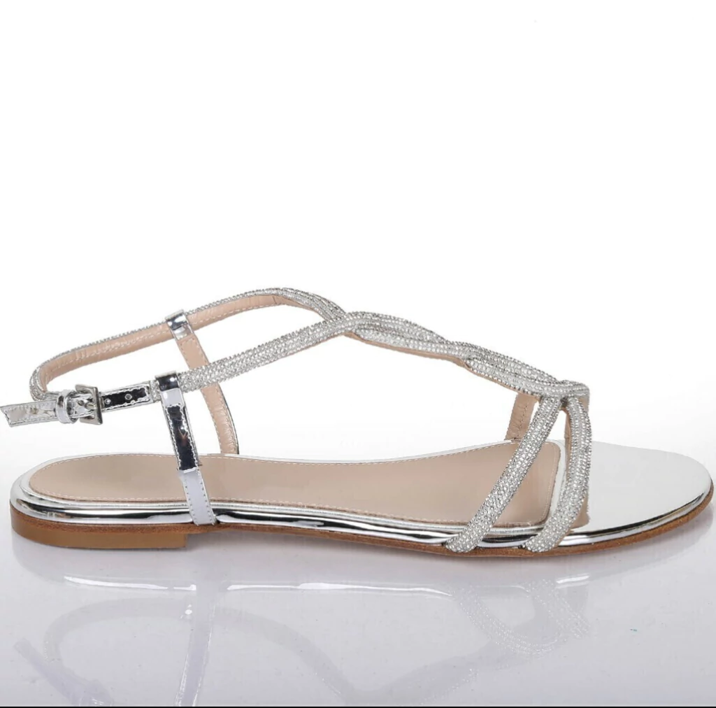 Sandália fechada no calcanhar , tiras entrelaçadas no peito do pé.