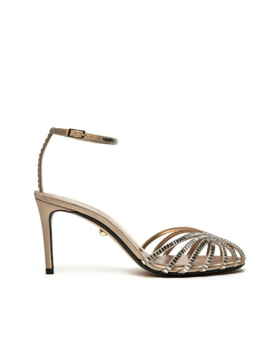 Sandália aberta no calcanhar, tira fina na parte do calcanhar para dar estabilidade, tiras em vidrilho que abraçam o pé